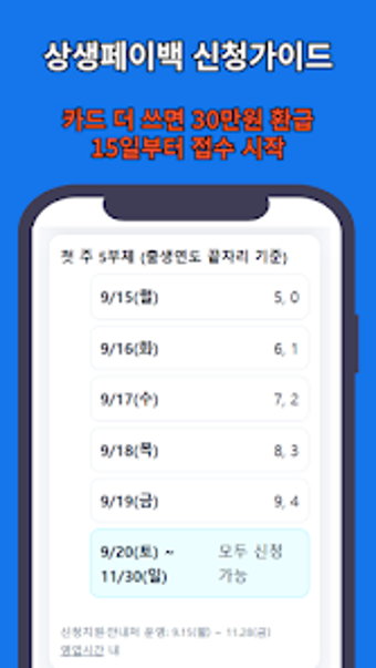 상생페이백 신청ガイドアプリは、ユーザーが상생페이백返金プログラムを通じて案内するためのユーザーフレンドリーなインターフェースを提供し、クレジットカードの利用促進を目的としています。プログラムの概要、適格性チェック、一般的な質問を明確にするためのFAQセクションなど、重要な機能を提供しています。ユーザーは、増加したカード支出に対して20%の返金を取得する方法を簡単に理解でき、最大返金額は3ヶ月で300,000 KRWです。